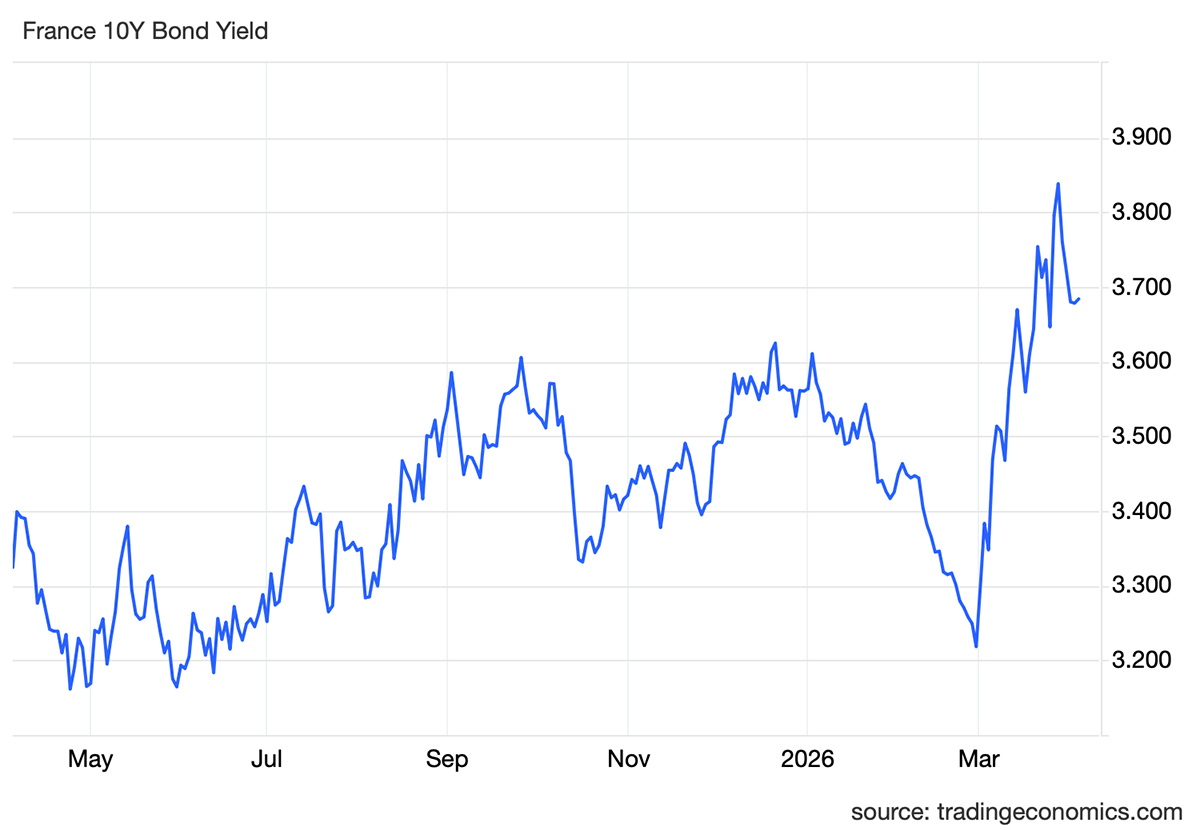 En ce qui concerne la France, les marchés financiers semblent s’inquiéter de la trajectoire des finances publiques. Les taux d’intérêt des emprunts d’État se sont nettement tendus avec le déclenchement des hostilités au Moyen-Orient.