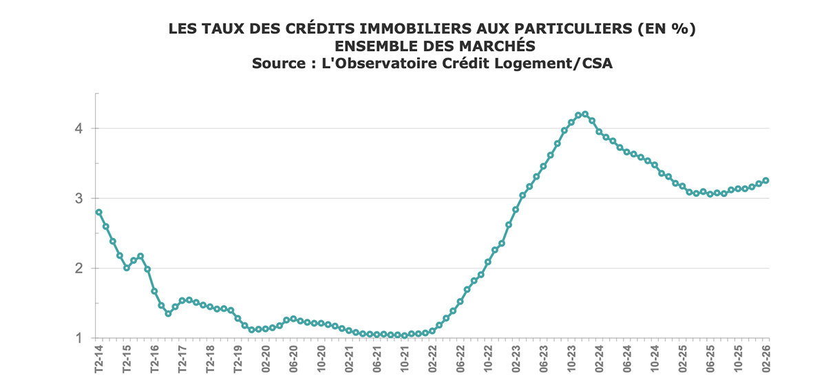 L’observatoire Crédit Logement a constaté un taux moyen de crédit (toutes durées confondues) de 3,25 % en février 2026 après 3,20 % en janvier et 3,16 % en décembre 2025.