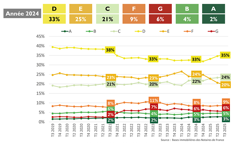 Plus des deux tiers des logements vendus au 3ème trimestre 2025 appartenaient aux trois classes C, D et E.